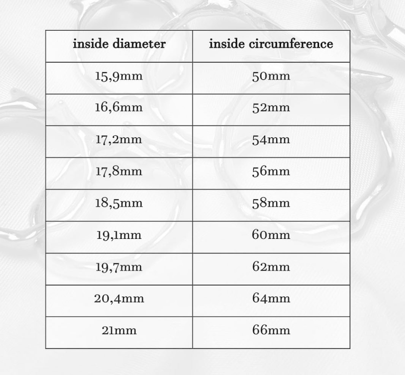 Our sizes are equivalent to the inside circumference. So another simple way to determine the perfect ring size is by using an existing ring. Simply measure the inner diameter of the ring in mm and convert it with our chart.
